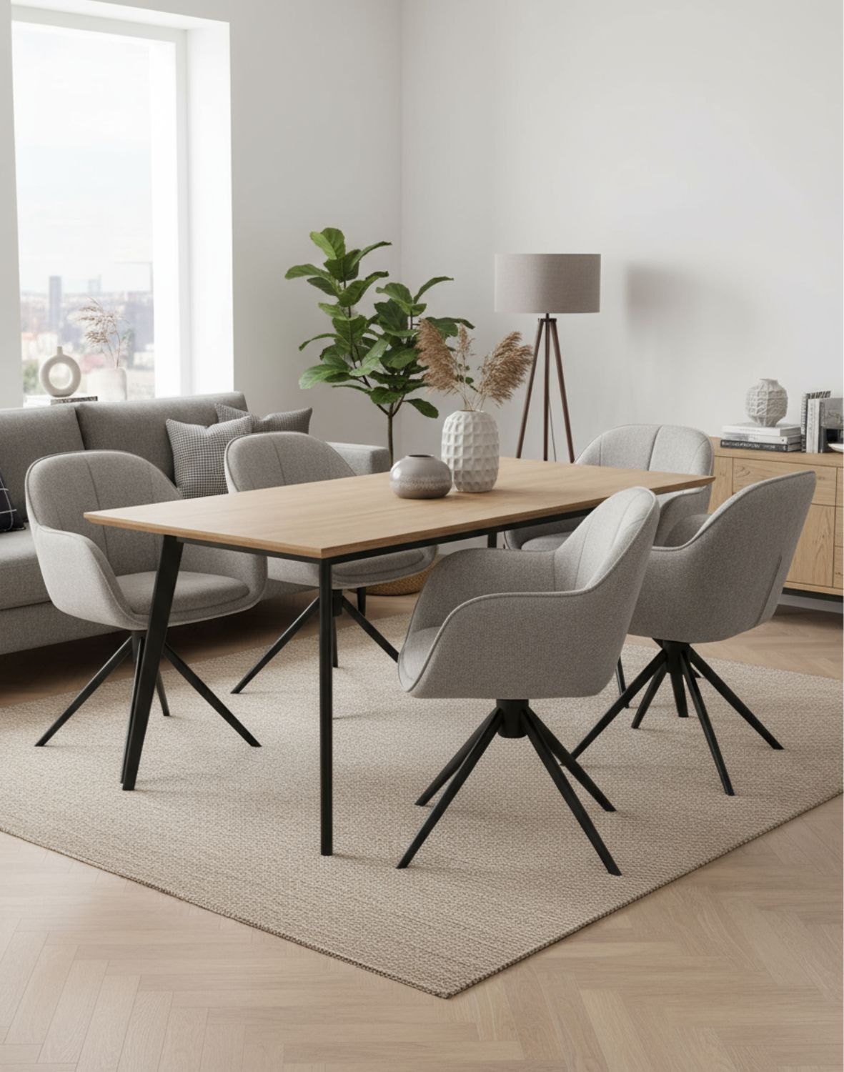Scaunul de dining pivotant Tessa bej închis de la Avida Design combină designul elegant, confortul și funcționalitatea.
