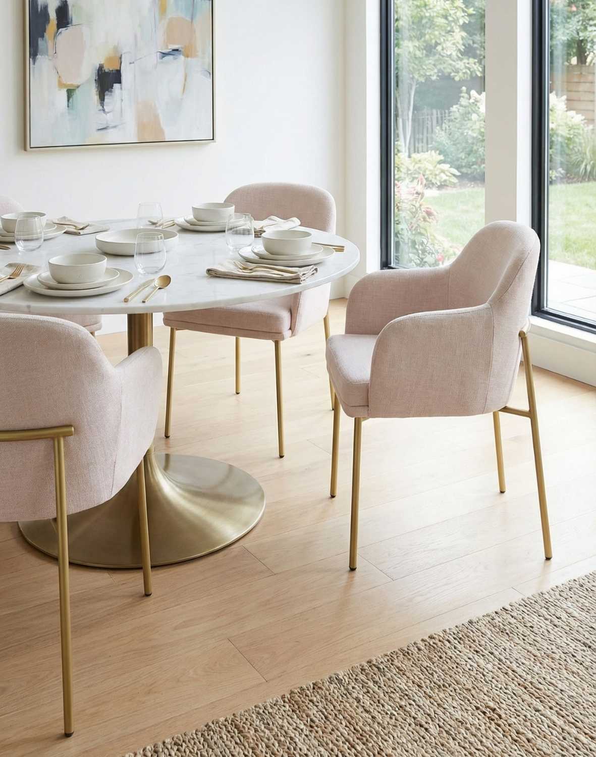 Scaunul de dining Zafiro Arm, cu picioare aurii și cotiere ample, de la Avida Design, este o piesă de mobilier pentru zona de dining sau living, care combină designul minimalist și confortul în utilizare.
