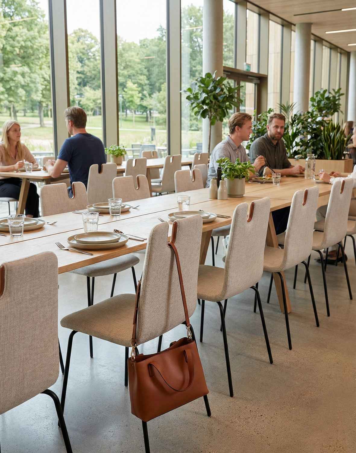 Scaunele Falun se disting prin decupajul de 4 cm. lățime de pe spătar, detaliu prezentat în imaginea de mai jos. Deschiderea este ideală pentru a atârna o geantă de mână, spre exemplu.