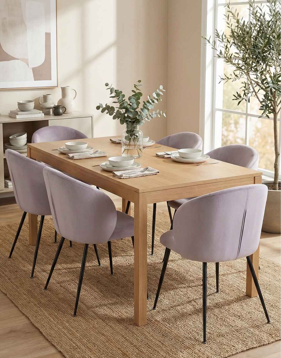 Țesătura moale a tapițeriei se potrivește perfect cu picioarele metalice, adăugând o notă modernă elegantă întregului ansamblu.