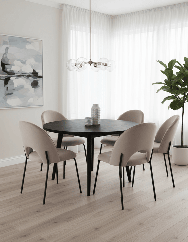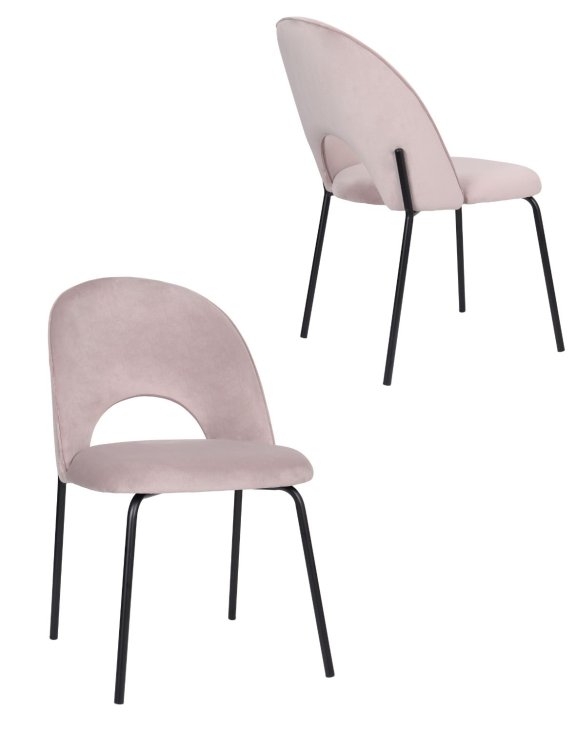 Scaunul de dining Molly Black de culoare gri deschis (cu tentă bej), cu picioare negre, tapițerie moale la atingere și forma spătarului modernă, se potrivește prin estetica sa cu cele mai recente tendințe de design interior.