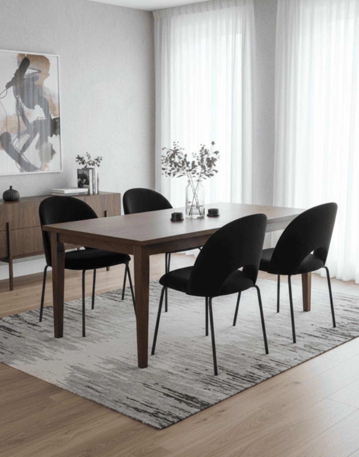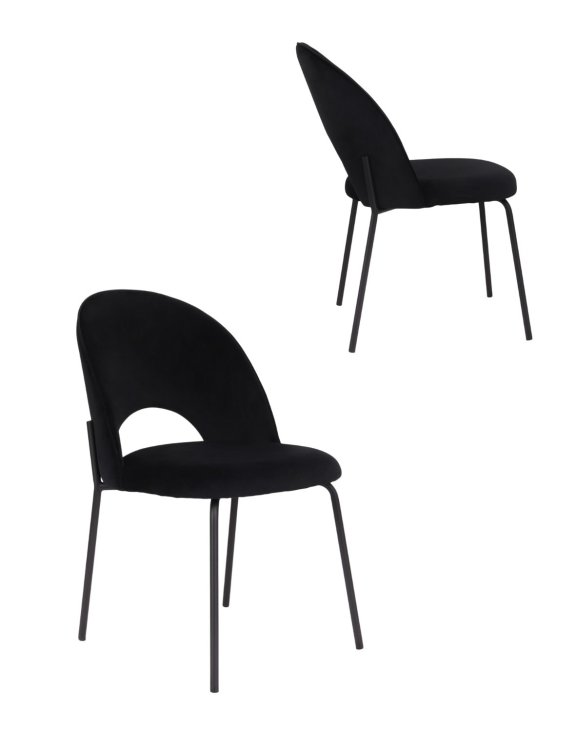 Scaunul de dining Molly Black de culoare negru, cu picioare negre, tapițerie moale la atingere și forma spătarului modernă, se potrivește prin estetica sa cu cele mai recente tendințe de design interior.