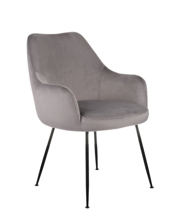 Scaun de dining elegant, cu tapițerie gri deschis și bază neagră. Se distinge față de modelele similare prin spătarul lat și curbat, și prin șezutul la fel de spațios.