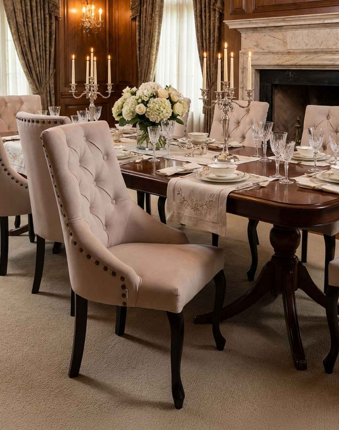 Scaunul Sisi 2 cu piuneze și picioare curbate în stil Louis este o piesă de mobilier atemporală pentru camera de zi, funcțională și plăcută din punct de vedere estetic.