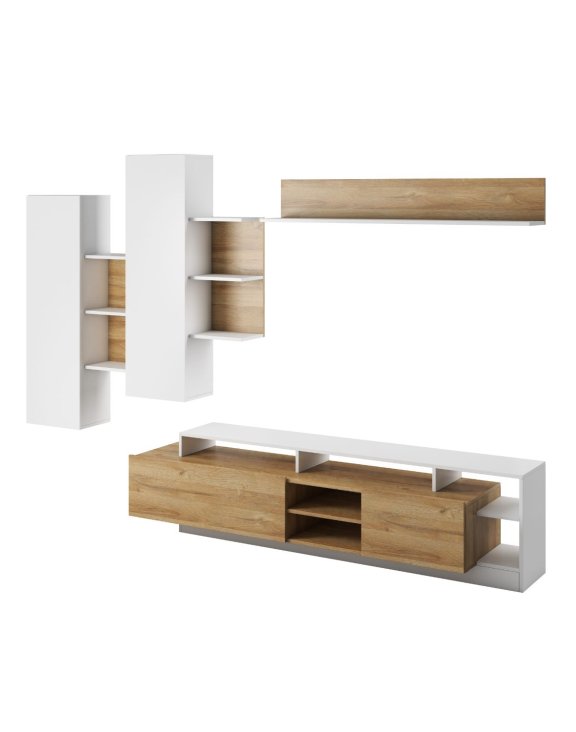 Set Alva, stejar grandson/alb: comodă TV + raft de perete + dulapuri suspendate