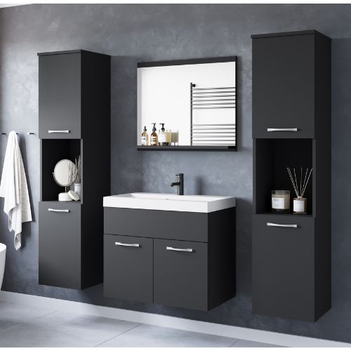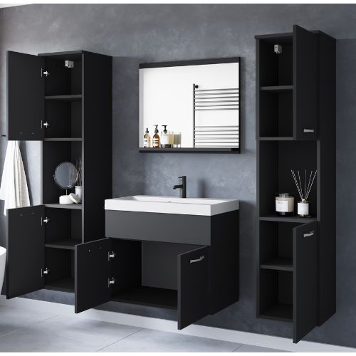 Setul de baie suspendat Montreal XL, în grafit, de la Bratex, include o chiuvetă, o mască spațioasă cu uși, două dulapuri înguste cu rafturi interioare și o oglindă cu raft convenabil pentru cosmetice.