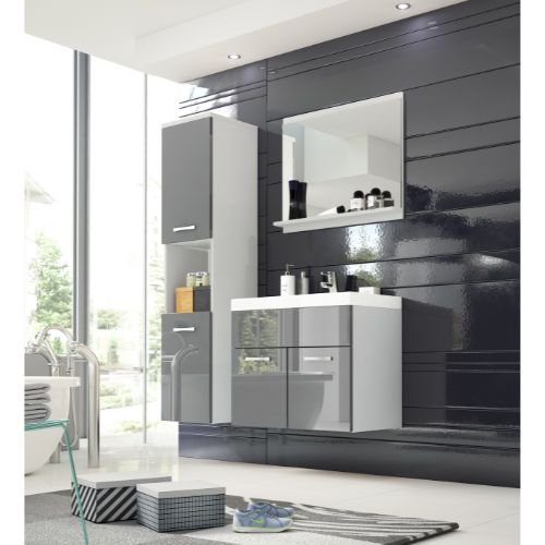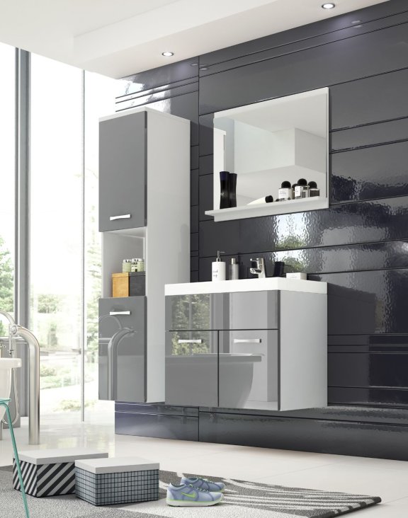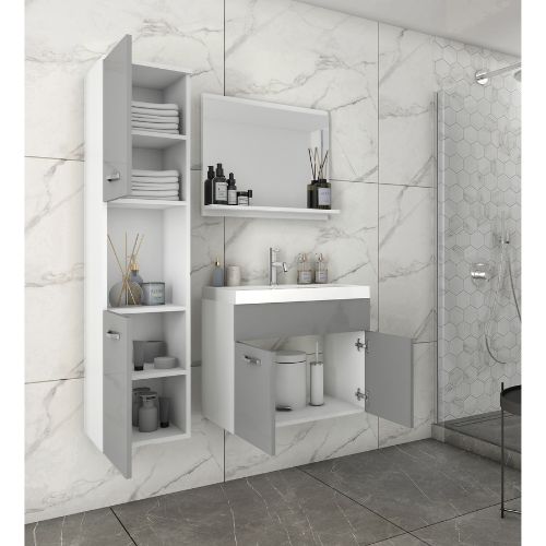Setul de baie suspendat Montreal, în alb/gri lucios, de la Bratex, include o chiuvetă, o mască spațioasă cu uși, un dulap îngust cu rafturi interioare și o oglindă cu raft convenabil pentru cosmetice.