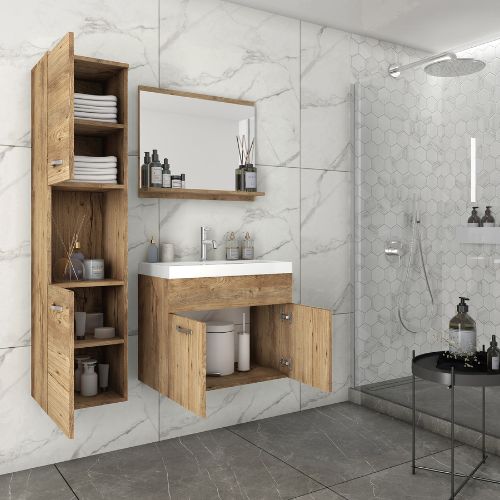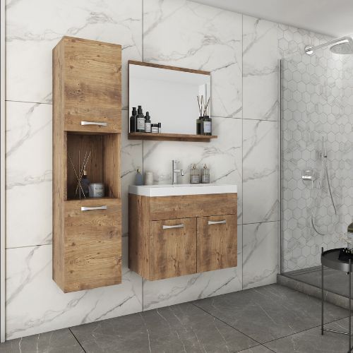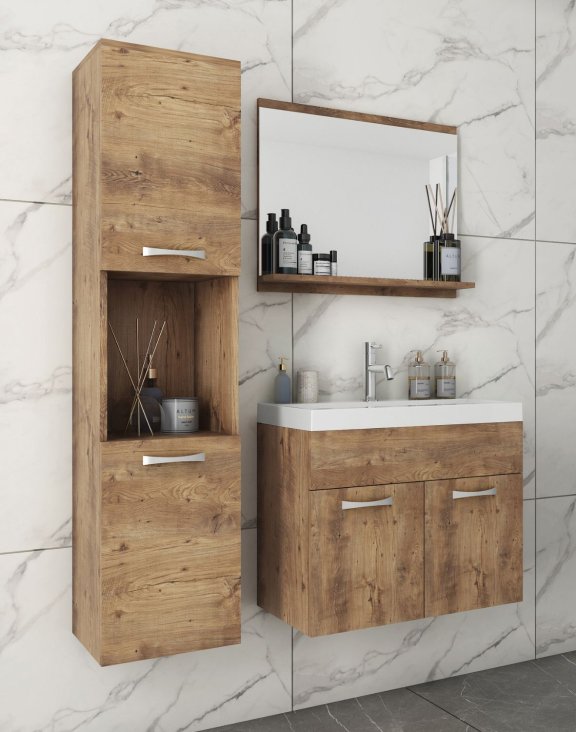 Setul de baie suspendat Montreal, în culoarea castan, de la Bratex, include o chiuvetă, o mască spațioasă cu uși, un dulap îngust cu rafturi interioare și o oglindă cu raft convenabil pentru cosmetice.