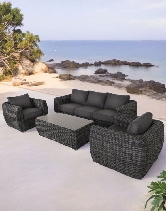 Setul este compus din patru piese (două fotolii, o canapea cu trei locuri și o măsuță de cafea cu blat din sticlă securizată) ideale pentru orice grădină sau terasă spațioasă. Setul va fi cu siguranță spațiul perfect pentru relaxare după o zi plină de activități în aer liber sau pentru întâlnirile cu familia și prietenii.
