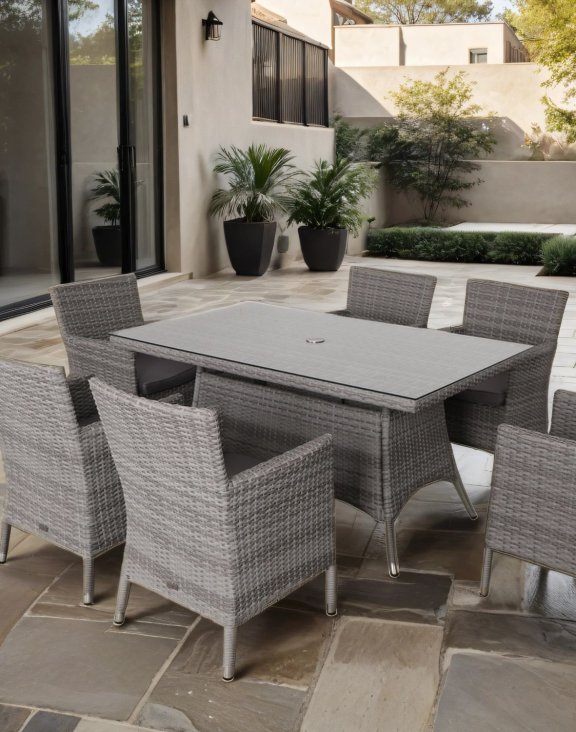 Setul de exterior Krk de la Snapty Garden, compus dintr-o masă și 6 scaune, combină confortul și design-ul unic cu funcționalitatea. Acesta reprezintă soluția perfectă pentru a-i conferi un aer mediteranean spațiului tău exterior.