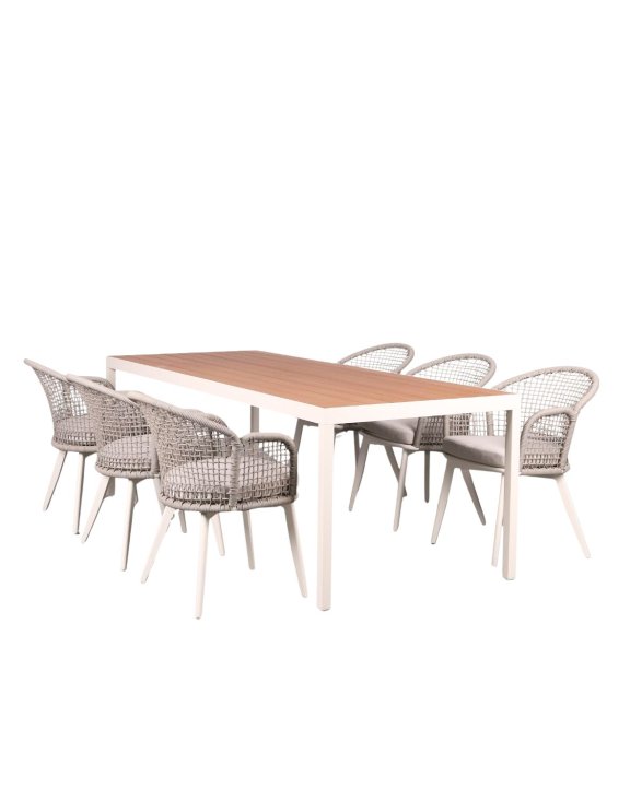 Setul include o masă de 220×90×75 cm, cu un blat din compozit de fibră de bazalt care imită aspectul cald al lemnului, precum și șase scaune din tehnoratan rezistent la razele UV.