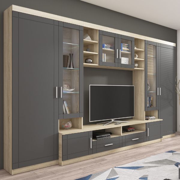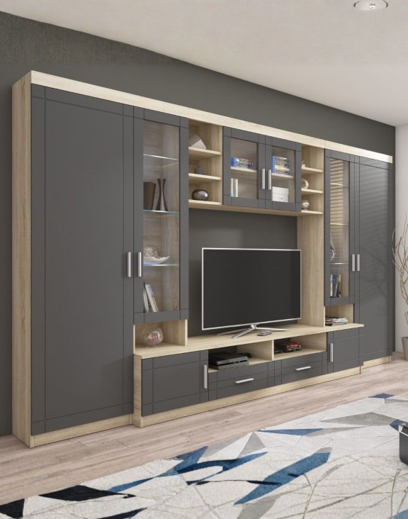 | Set de living Paris, grafit/stejar sonoma: comodă TV + 2 vitrine + dulap suspendat | 4160 RON |