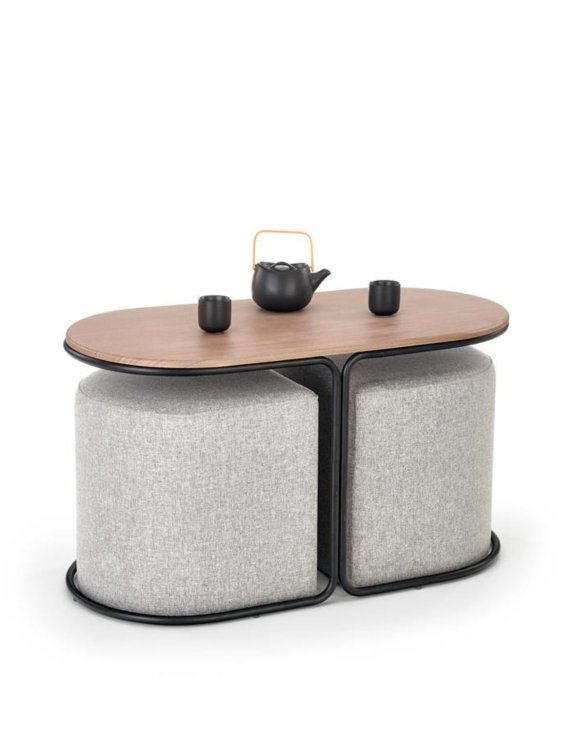 Datorită formelor și dimensiunilor care se potrivesc, taburetele încap perfect sub măsuța, valorificând la maximum spațiul rămas în încăpere.