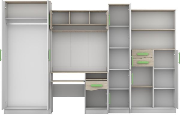 Setul include, de asemenea, un dulap cu două uși ce ascunde o bară și un raft pentru haine, precum și un dulap îngust, cu numeroase rafturi interioare, ambele ajutând la menținerea ordinii în încăpere.