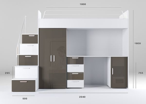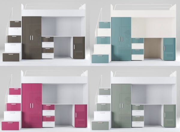 Setul include: - pat supraetajat (în partea superioară) cu cadru și saltea; - birou cu sertare și cu dulăpior; - dulap spațios pentru haine; - trepte cu sertare încorporate.