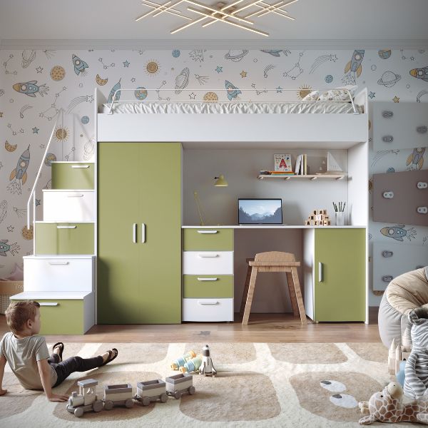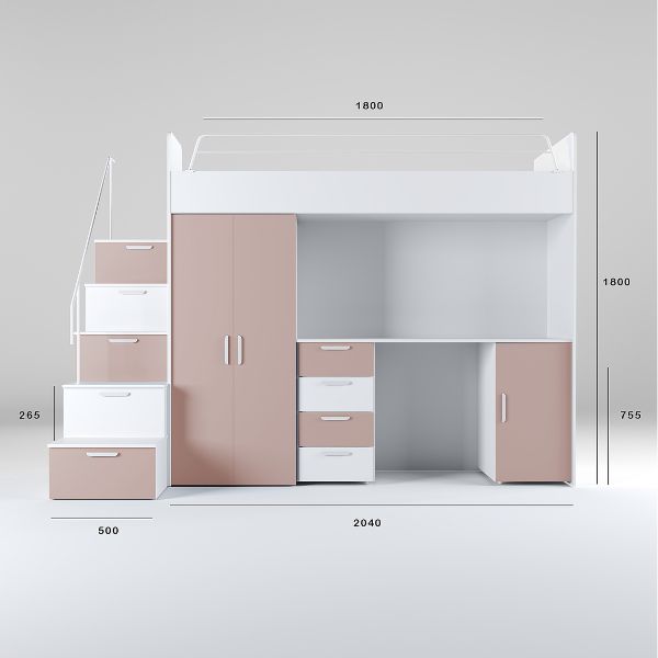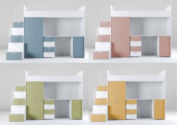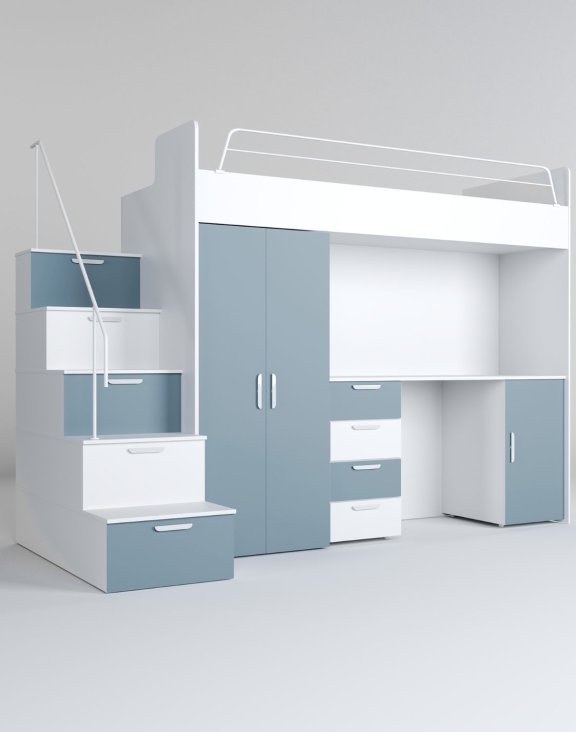 Setul include: - pat supraetajat (în partea superioară) cu cadru și saltea; - birou cu sertare și cu dulăpior; - dulap spațios pentru haine; - trepte cu sertare încorporate.