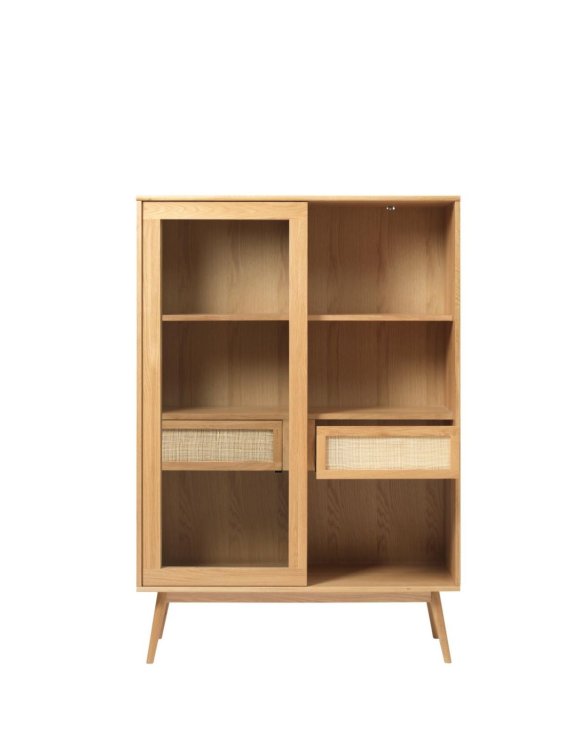 Aceasta este dotată cu uși glisante cu sticlă, cu două sertare compacte ornate cu ratan și cu rafturi reglabile pe înălțime.