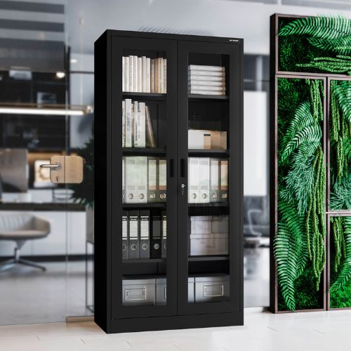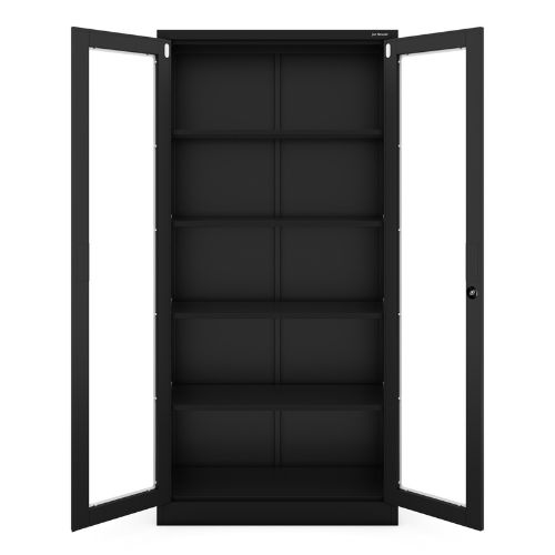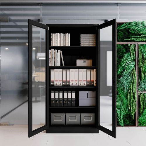 Ușile elegante sunt realizate din sticlă și din metal acoperit cu pulbere în culoarea atemporală negru.