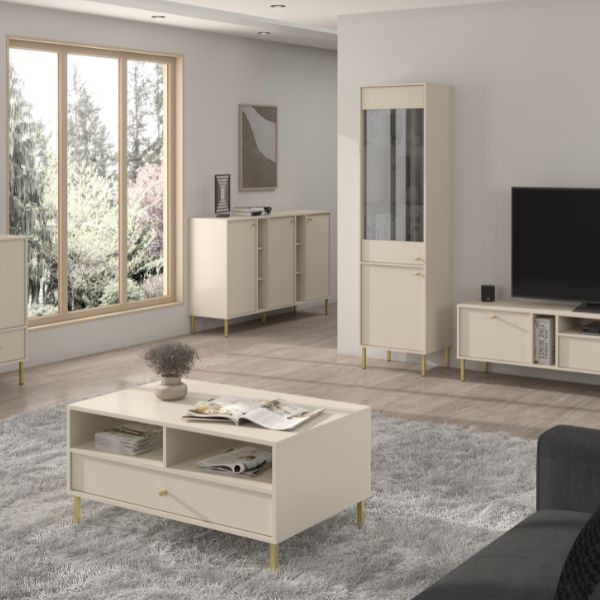 Vitrina înaltă Tokyo 2, în culoarea bej nisipiu, de la Stolarz Lempert, va aduce un suflu nou în amenajarea casei tale.