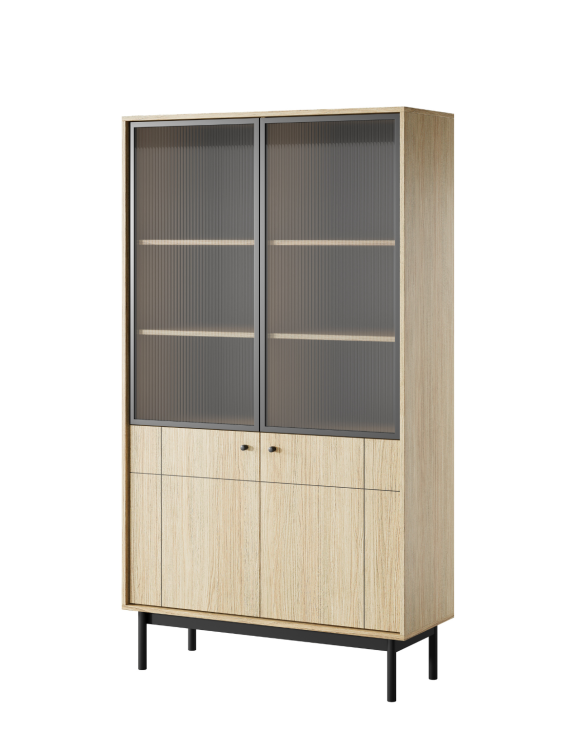 Vitrina Japandi, în culoarea stejarului Linea, de la Piaski este o piesă de mobilier unică, care combină estetica stilului japonez cu funcționalitatea modernă.