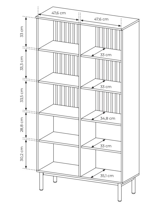 • Vitrina este realizată din plăci laminate E05 cu margini din ABS, rezistente la deteriorări și ușor de întreținut.