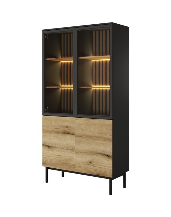 • Vitrina Lang (L) de la Laski este o piesă de mobilier modernă care impresionează prin aspectul său elegant, îmbinând căldura culorii stejar evoke cu intensitatea negrului.