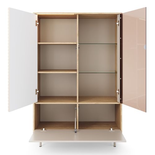 Vitrina este echipată cu un sistem de deschidere-închidere silențios (de tip „soft-close”), iar balamalele și amortizoarele de înaltă calitate îți asigură o utilizare lină și facilă.